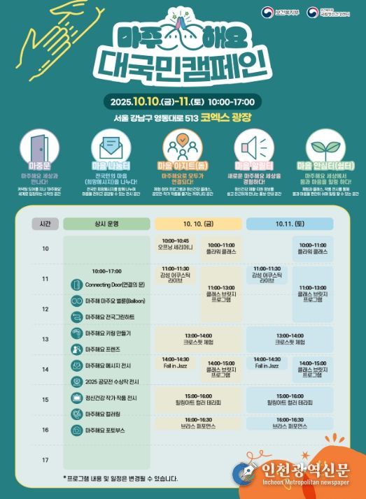 [인천광역신문] 관리자 기자 | 보건복지부와 국립정신건강센터는 ‘정신건강의 날’을 맞아 10월 10일에서 11일까지 양일간 서울 코엑스 야외광장에서 '마주해요! 대국민 캠페인'을 개최한다.