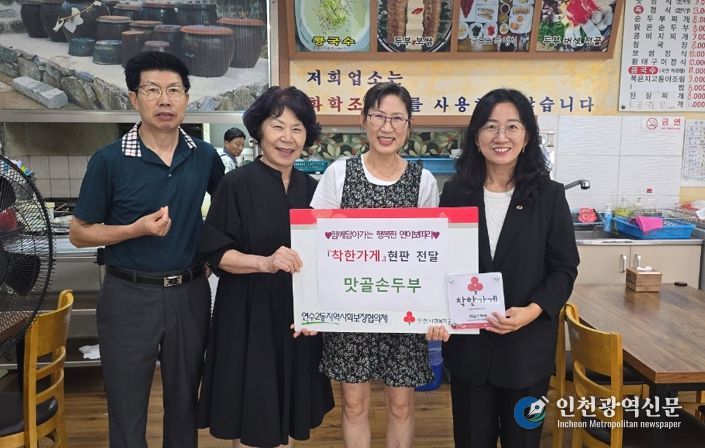 [인천광역신문] 최예준 기자 | 연수구 연수2동 지역사회보장협의체는 지난달 29일 관내 장기요양기관 ‘엔젤복지용구’와 식당 ‘맛골 손두부’에 나눔 인증 ‘착한가게’ 현판을 전달하고 지역사회 나눔 실천에 감사의 뜻을 표했다.