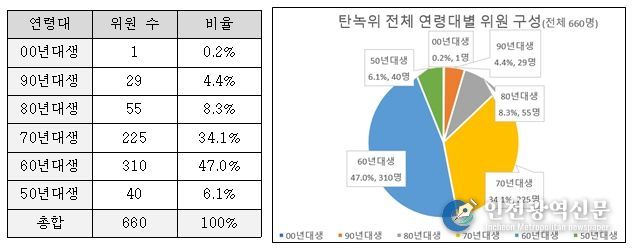 대통령 직속 탄녹위와 지방탄녹위 구성 현황을 출생연대별로 살펴보면, 전체 위원 660명 중 50~70년대생은 575명으로 87.1%를 차지한다. 50년대생(65세~75세)은 6.1%(40명), 60년대생(55세~65세)은 47.0%(310명), 70년대생(45세~55세)은 34.1%(225명)이다. 반면, 80년대생(35세~45세)은 8.3%(55명)이며, 90년대생(25세~35세)은 4.4%(29명)에 그쳤다. 청년 위원은 3.9%(26명)이다. 00년대생은 1명으로, 경상북도 탄녹위 소속이다.