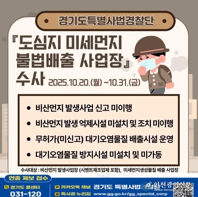 [인천광역신문] 관리자 기자 | 경기도 특별사법경찰단은 오는 20일부터 31일까지 2주간, 도심지 내 미세먼지 주요 발생 사업장을 대상으로 불법행위를 집중 수사한다.
