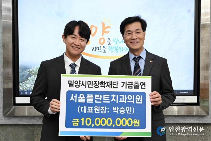 [인천광역신문] 관리자 기자 | (재)밀양시민장학재단은 13일 밀양시장실에서 서울플란트치과의원으로부터 장학기금 1,000만원을 기탁받았다고 밝혔다.