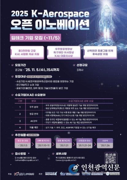 [인천광역신문] 관리자 기자 | 우주항공청은 10월 13일 우주항공청이 주최하고 한국항공우주산업㈜, 연구개발특구진흥재단, 진주강소특구(경상대학교), 한국항공우주연구원이 주관하는 '2025 K-Aerospace 오픈 이노베이션'을 추진하여 딥테크 기업을 육성할 계획이라고 밝혔다.