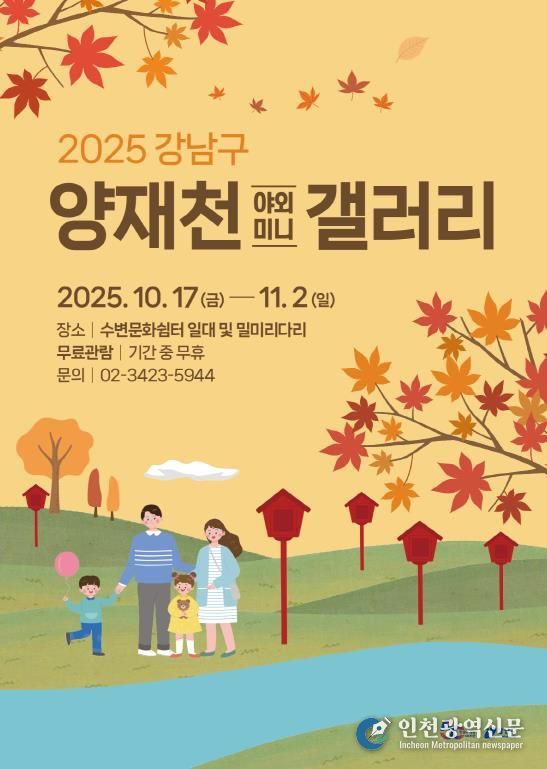[인천광역신문] 최훈 기자 | 꿈이 모이는 도시, 미래를 그리는 강남구가 오는 10월 17일부터 11월 2일까지, 양재천 수변문화쉼터~밀미리교 구간 산책로에서 ‘양재천 미니 아트 갤러리’를 운영한다.