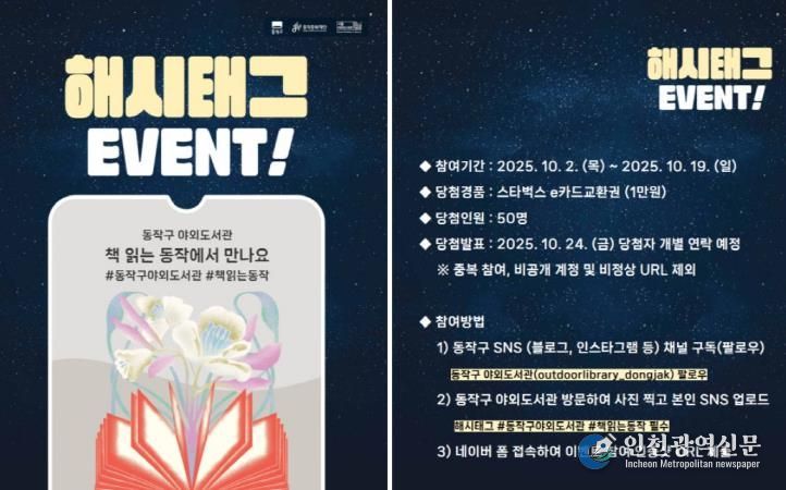 [인천광역신문] 최훈 기자 | 동작구가 지난 9월 25일 보라매공원에 문을 연 야외도서관 ‘책 읽는 동작’이 인증샷 이벤트로 그 열기를 이어간다.