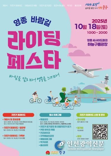 김정헌 중구청장은 “영종국제도시는 바다와 하늘이 만나 뛰어난 풍광을 자랑한다는 점에서 자전거 나들이로 탁월한 명소”라며 “올가을, 많은 시민이 영종 바람길 라이딩 페스타에서 특별한 추억을 쌓길 바란다”라고 밝혔다.