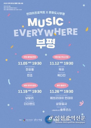 [인천광역신문] 최예준 기자 | 부평구 문화재단 문화도시센터는 오는 11월 매주 수요일 오후 7시 30분 지역 뮤지션들의 공연 ‘MUSIC EVERYWHERE 부평’을 총 4회에 걸쳐 진행한다고 밝혔다.