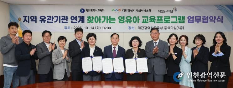 [인천광역신문] 관리자 기자 | 대전시교육청은 10월 14일 대전광역시사회서비스원 및 대전문화재단과'지역 유관기관 연계 찾아가는 영유아 교육프로그램'운영 업무협약을 체결했다고 밝혔다.