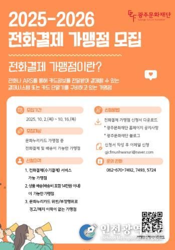 [인천광역신문] 관리자 기자 | 광주문화재단은 문화누리카드 이용이 어려운 시민들을 위해 전화 한 통으로 문화생활을 즐길 수 있는 전화결제 가맹점을 오는 10월 16일까지 모집한다.