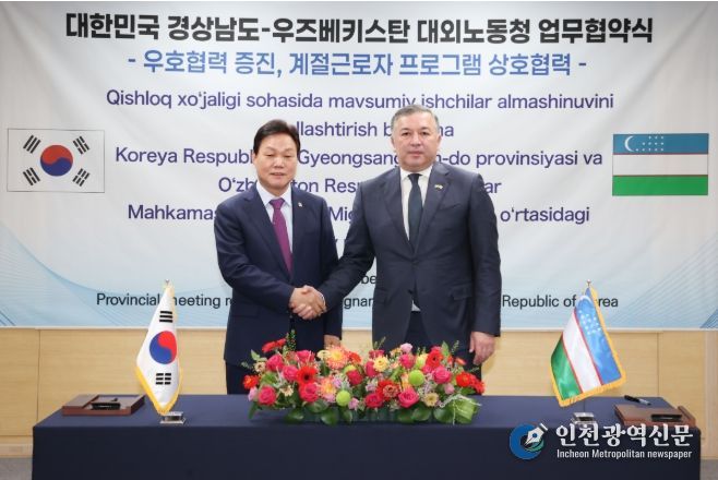 [인천광역신문] 관리자 기자 | 경상남도는 14일 도청 도정회의실에서 밀양·창녕·합천 3개 시군이 우즈베키스탄 정부와 농업 분야 외국인 계절근로자 도입을 위한 업무협약(MOU)을 체결했다고 밝혔다.