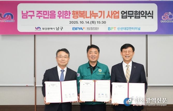 [인천광역신문] 관리자 기자 | 부산 남구청은 지난 10월 14일, 부산항만공사(BPA), 신선대감만터미널(BPT)과 남구 지역 취약계층을 지원하는 '2025년 행복나누기 사업' 업무협약을 체결했다고 밝혔다.