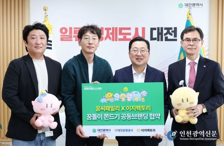 대전시는 15일 시청 10층 응접실에서 대전관광공사, 이지팩토리와 함께 전통과자 쫀드기 출시를 위한 공동브랜딩 업무협약을 체결했다.