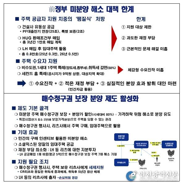 안 의원은 재정 부담은 최소화하면서도 분양 효과를 높일 수 있는 실질적 대안으로 ‘매수청구권 보장 분양제도’를 제안했다. 이 제도는 ▲미분양 주택의 분양가를 시세의 80% 수준으로 할인하고, ▲수분양자에게 매수청구권을 부여해 가격 하락 위험을 완화함으로써 민간 수요를 유인하는 방식이다.