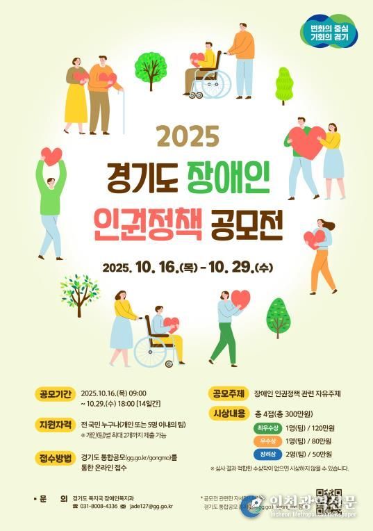 [인천광역신문] 관리자 기자 | 경기도가 장애인의 정책 참여 확대, 실효성 있는 제도 개선, 생활 속 인권 향상과 인식 개선을 위한 정책 아이디어 발굴을 위해 10월 16일부터 29일까지 ‘2025년 경기도 장애인 인권정책 공모전’을 개최한다.