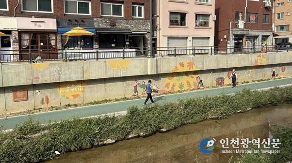 [인천광역신문] 최훈 기자 | 방학천(금강아미움 맞은편~방학교) 옹벽 약 360m 구간이 걷고 싶고 머무르고 싶은 산책길로 탈바꿈했다.