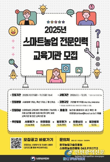 [인천광역신문] 관리자 기자 | 농림축산식품부는 스마트농업 분야 전문인력 양성에 대한 현장수요가 높아짐에 따라, 10월 17일부터 11월 7일까지 '스마트농업 전문인력 교육기관'을 추가 모집한다.