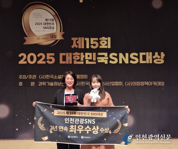 [인천광역신문] 최예준 기자 | 인천광역시와 인천관광공사(사장 백현)는 인천관광 SNS가‘2025 대한민국 SNS 대상’ 공공부문에서 최우수상을 수상하며, 2년 연속 수상의 영예를 안았다고 밝혔다.