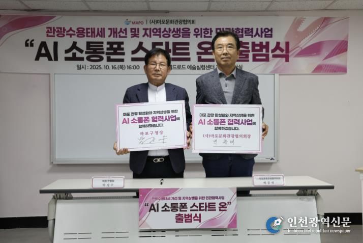 마포구는 10월 16일 오후 4시, 레드로드예술실험센터 2층 세미나실에서 ‘AI 소통폰 스타트 온(Start ON)’ 협력사업 출범식을 열고 외국인 관광객과 상인의 소통 강화를 위한 민관 협력의 첫발을 내디뎠다.