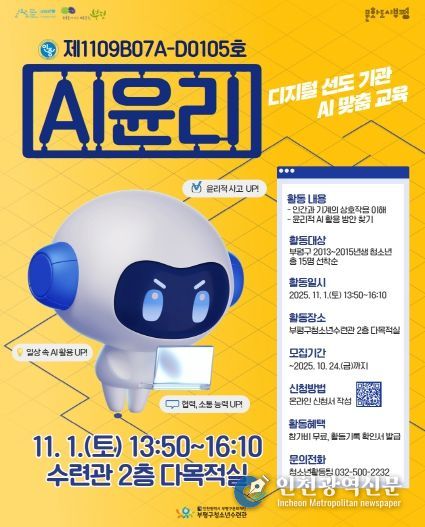 [인천광역신문] 최예준 기자 | 부평구 청소년수련관은 오는 24일까지 부평 내 11~13세 청소년을 대상으로 ‘AI 윤리’ 참가자를 모집한다.
