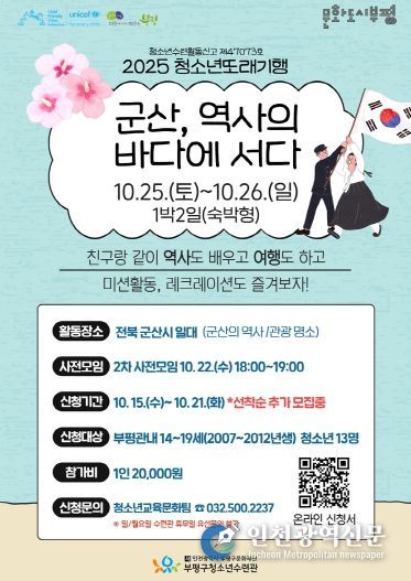 [인천광역신문] 최예준 기자 | 부평구 청소년수련관은 오는 21일까지 ‘2025 청소년 또래기행 - 군산, 역사의 바다에 서다’에 참가할 청소년을 모집한다.