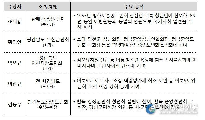 한편, 이번 대회에서는 올해 ‘국가사회발전 이북도민 유공’ 정부포상자로 선정된 39명 중 5명의 유공도민에게 국민훈장 동백장이 수여된다.