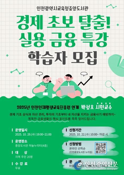 [인천광역신문] 최예준 기자 | 인천광역시교육청중앙도서관은 10월 29일 오후 7시 ‘경제 초보 탈출! 실용 금융 특강’에 참여할 학습자를 모집한다.
