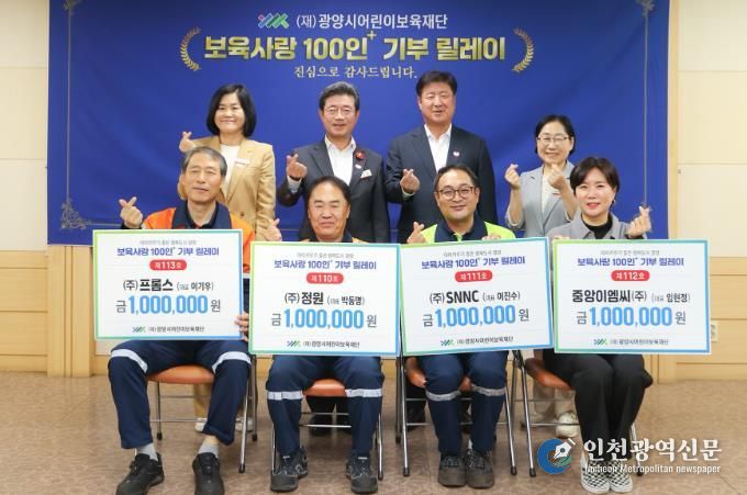 [인천광역신문] 관리자 기자 | (재)광양시어린이보육재단이 지난 10월 20일 광양시청 만남실에서 ‘보육사랑 100인+ 기부 릴레이’ 후원금 기탁식을 개최했다.