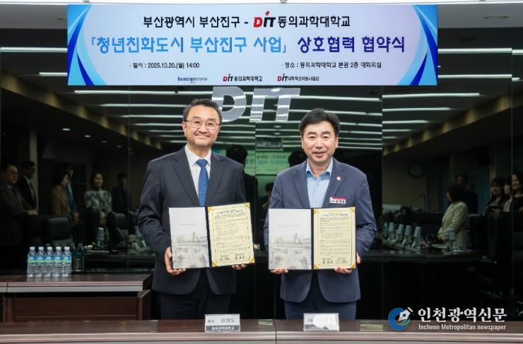 [인천광역신문] 관리자 기자 | 부산 부산진구는 10월 20일 오후 2시, 동의과학대학교 본관 대회의실에서 동의과학대학교와 ‘청년친화도시 부산진구 사업’ 상호협력 협약을 체결했다고 밝혔다.