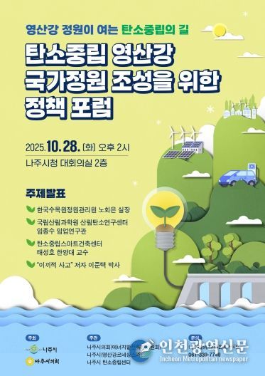 [인천광역신문] 관리자 기자 | 나주시의회는 나주시와 오는 28일 오후 2시, 나주시청 대회의실에서 '탄소중립 영산강 국가정원 조성을 위한 정책포럼'을 공동 개최한다고 21일 밝혔다. 이번 포럼은 탄소중립 실현을 위한 다양한 전략을 모색하고, 향후 영산강 국가정원 지정의 구체적 방향을 논의하기 위해 마련됐다.
