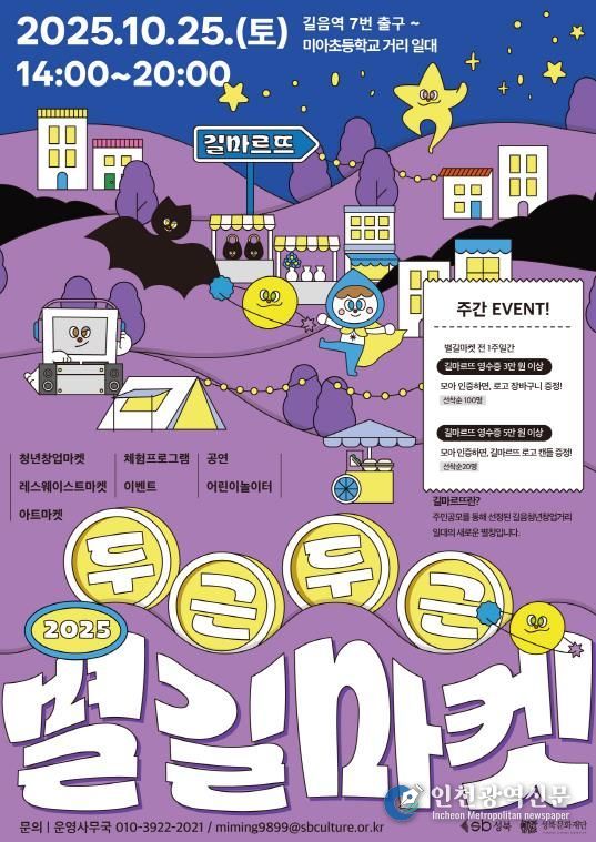 [인천광역신문] 최훈 기자 | 성북구가 오는 25일, 길음동 삼양로(길음역~미아초등학교 구간) 일대에서 ‘2025 두근두근 별길마켓’을 개최한다. 행사는 오후 2시부터 8시까지 진행되며, 오후 2시 40분에는 삼양로 국민대학교 길음생활관 앞에서 오카리나 사전공연과 함께 개막식이 열린다.