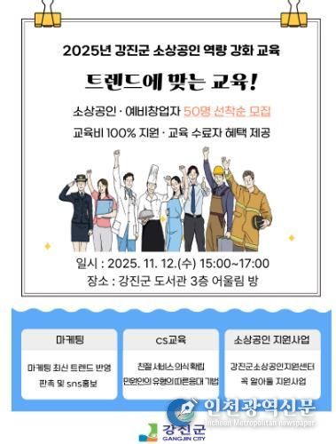 [인천광역신문] 관리자 기자 | 강진군이 관내 소상공인과 예비창업자를 대상으로 매출 증대를 위한 실전 중심의 교육을 운영한다.