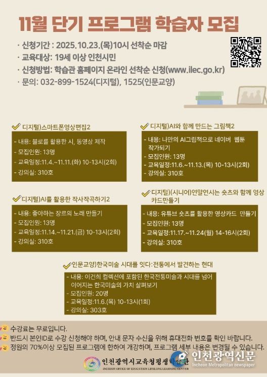 [인천광역신문] 최예준 기자 | 인천광역시교육청평생학습관은 오는 11월 운영되는 단기 프로그램의 수강생을 모집한다.
