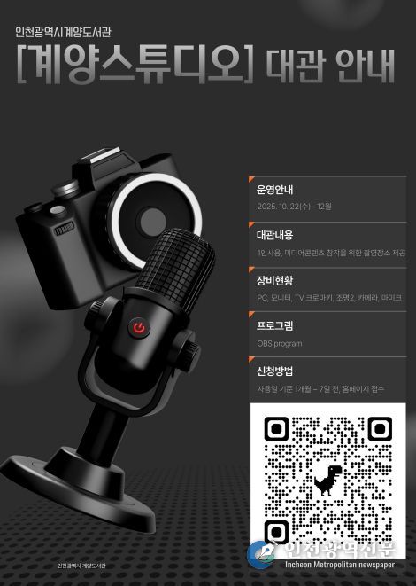 [인천광역신문] 최예준 기자 | 인천광역시교육청계양도서관은 지역 주민의 창의적 미디어 활동을 지원하기 위해 1층 어린이열람실 일부 공간에‘계양 스튜디오’를 조성하고 10월 22일부터 누리집 및 전화를 통해 무료 대관을 시작한다.