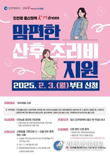 [인천광역신문] 최예준 기자 | 부평구 보건소는 취약계층 산모를 대상으로 ‘맘편한 산후조리비 지원 사업’을 운영 중이라고 22일 밝혔다.
