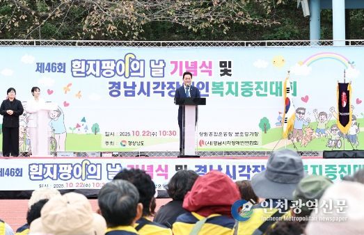 [인천광역신문] 관리자 기자 | 경남도는 22일 오전 창원스포츠파크 보조경기장에서 열린 ‘제46회 흰 지팡이의 날 기념식’에서 “흰 지팡이는 시각장애인의 자립과 성취, 평등한 사회 참여를 상징한다”며 “오늘이 더불어 살아가는 사회를 위해 흰 지팡이의 의미를 알리는 날이 되길 바라며, 시각장애인의 권익과 복지 증진에 힘쓰겠다”고 밝혔다.