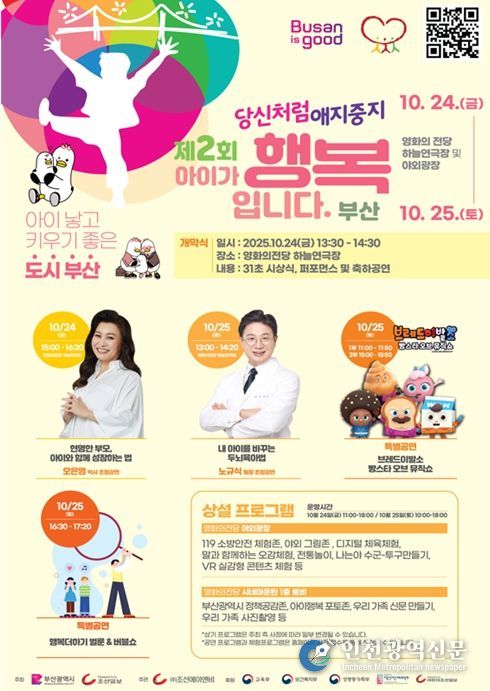 [인천광역신문] 관리자 기자 | 부산시는 내일(24일)과 25일 양일간 영화의전당 하늘연극장 및 야외광장에서 저출생 대응 캠페인 당신처럼 애지중지 '제2회 아이가 행복입니다. 부산'을 개최한다고 밝혔다.