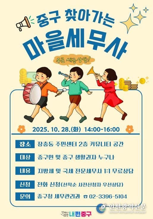 [인천광역신문] 최훈 기자 | 서울 중구가 오는 28일 장충동 주민센터에서 오후 2시부터 4시까지 '찾아가는 마을세무사'를 운영한다.