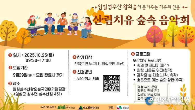 [인천광역신문] 관리자 기자 | 임실군이 오는 25일 성수산 왕의숲 국민여가캠핑장 일원에서‘성수산 왕의숲 산림치유 숲속 음악회’를 개최한다.