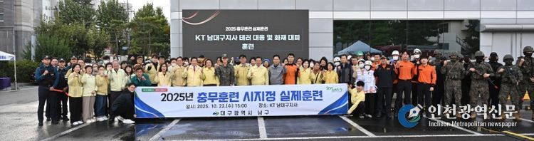 [인천광역신문] 관리자 기자 | 대구 남구는 지난 22일, KT 남대구지사 주차장에서 테러범에 의한 인질극 발생을 가정한 인질 구출, 테러범 진압 훈련 및 드론 테러에 의한 화재발생 시 대피훈련, 화재진압, 복구 작업 등 테러·화재 대비를 주제로 한 『2025 충무훈련 실제훈련』을 실시했다.