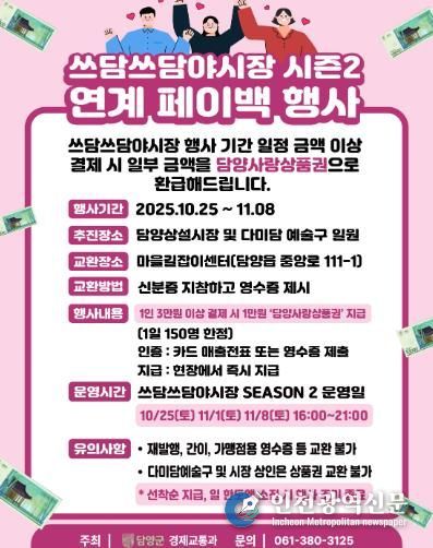 [인천광역신문] 관리자 기자 | 담양군은 가을 정취가 짙어지는 10월과 11월, 담양읍 다미담예술구와 담양시장 일원에서 오는 25일부터 11월 8일까지 매주 토요일마다 ‘쓰담쓰담 야시장 시즌2’를 연다.