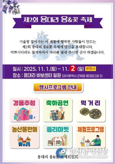 [인천광역신문] 관리자 기자 | 용대리 마을회와 용대리 용&꽃 축제위원회는 오는 11월 1일부터 2일까지 이틀간, 용대리 마을회관 및 바보센터 일원에서 '제2회 용대리 용&꽃 축제'를 개최한다.