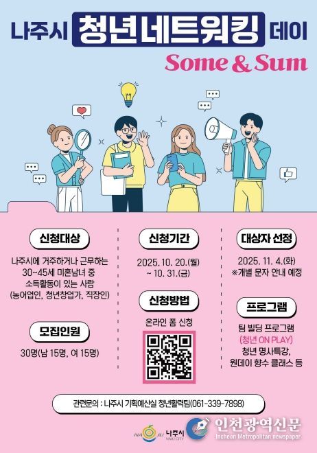 [인천광역신문] 관리자 기자 | 전라남도 나주시가 지역 청년들의 교류와 소통을 활성화하기 위해 미혼청년을 대상으로 한 ‘청년 네트워킹 데이’ 참가자를 모집한다.