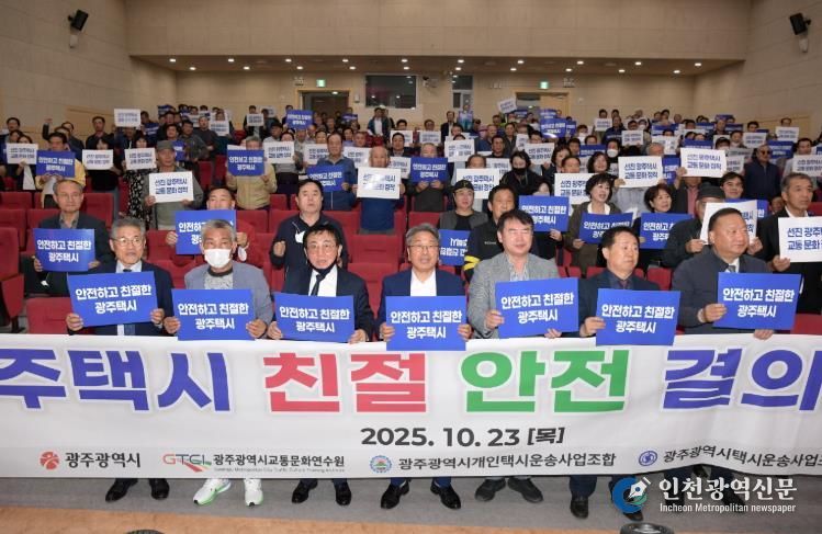 [인천광역신문] 관리자 기자 | 광주광역시는 23일 광주교통문화연수원에서 ‘택시운수종사자 친절·안전 결의대회’를 열고 신뢰받는 택시 서비스 구현을 위한 실천 의지를 다졌다.