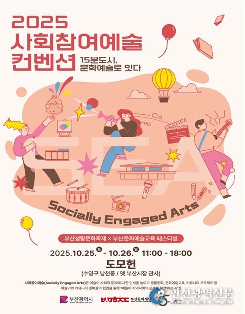 [인천광역신문] 관리자 기자 | 부산시는 내일(25일)부터 26일까지 이틀간 도모헌(옛 부산시장 관사)과 장애인예술창작공간인 온그루에서 생활문화에 문화예술교육을 더한 '2025 사회참여예술 컨벤션'을 개최한다고 밝혔다.