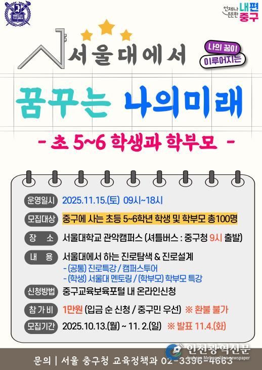 [인천광역신문] 최훈 기자 | 서울 중구가 오는 11월 15일과 22일, 서울대학교 관악캠퍼스에서 관내 초·중학생 및 학부모를 대상으로 하는 '2025 서울대연계 진로심화 프로그램 '꿈꾸는 나의 미래''를 운영한다.