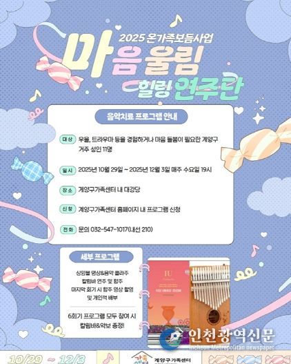 [인천광역신문] 최예준 기자 | 인천 계양구가족센터(센터장 권도국)는 오는 10월 29일부터 상담 대기자와 심리·정서적 어려움을 겪는 취약위기가정을 대상으로 음악치료 프로그램 ‘마음 울림, 힐링 연주단’을 운영한다.