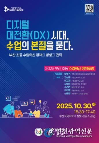 [인천광역신문] 관리자 기자 | 부산광역시교육청은 오는 30일 오후 부산교육대학교 참빛극장에서 초등 교원과 교육전문직원 등 200여 명을 대상으로 ‘디지털 대전환(DX)* 시대, 수업의 본질을 묻다’를 슬로건으로 ‘2025 부산 초등 수업혁신 정책포럼’을 개최한다고 밝혔다.