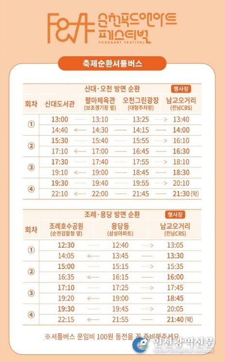 셔틀버스의 승하차 장소는 남교오거리이며, 운행 노선과 시간표 및 이벤트 내용은 순천푸드앤아트페스티벌 홈페이지와 순천 관광 공식 SNS를 통해 안내될 예정이다.