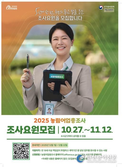 [인천광역신문] 관리자 기자 | 장수군은 ‘2025 농림어업총조사’의 원활한 추진을 위해 27일부터 다음 달 12일까지 조사요원을 모집한다고 밝혔다
