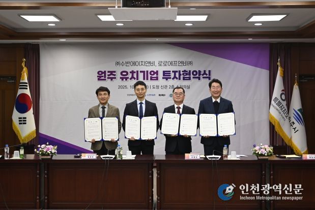 [인천광역신문] 관리자 기자 | 원주시는 27일 오전 11시, 강원특별자치도청 신관 2층 소회의실에서 원강수 시장, 김진태 도지사, 이명심 로로에프엔비㈜ 상무이사, 정동인 ㈜수반에이치앤비 대표이사 등이 참석한 가운데 원주 공장 신설을 위한 투자협약을 체결했다.
