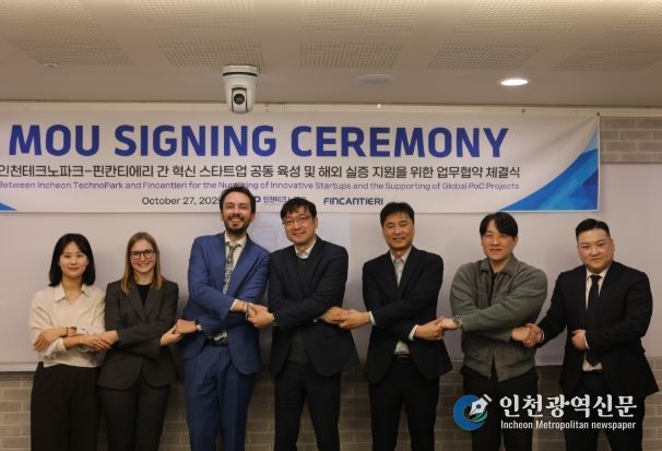 [인천광역신문] 최예준 기자 | 인천테크노파크(인천TP)는 27일 인천스타트업파크에서 이탈리아 국영 조선사 핀칸티에리(Fincantieri)와 ‘혁신 스타트업 육성 및 해외 실증 지원’에 상호 협력 내용으로 업무협약을 체결했다.
